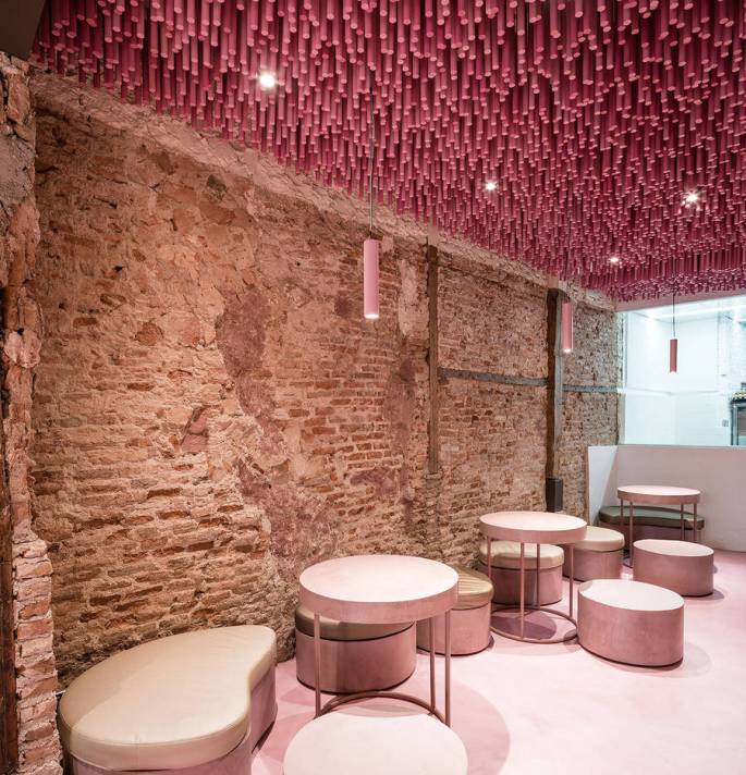 Quem não gostaria de visitar essa confeitaria em Madri? Criado pelo Estúdio Ideo Arquitetura, 12.000 varetas de madeira na cor magenta cobrem todo o teto, mantendo o estilo contemporâneo e inusitado. As paredes em pedra fazem parte do próprio edifício (histórico) da região, criando um contraste entre o moderno e o rústico atraindo a curiosidade … Continue lendo Inovar é preciso! Design único é marca registrada em confeitaria de Madri