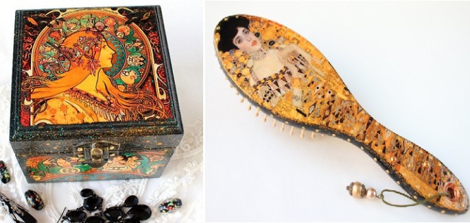 Trabalho lindo! Escovas, caixas de jóias e espelhos inspirados em Gustav Klimt e Mucha